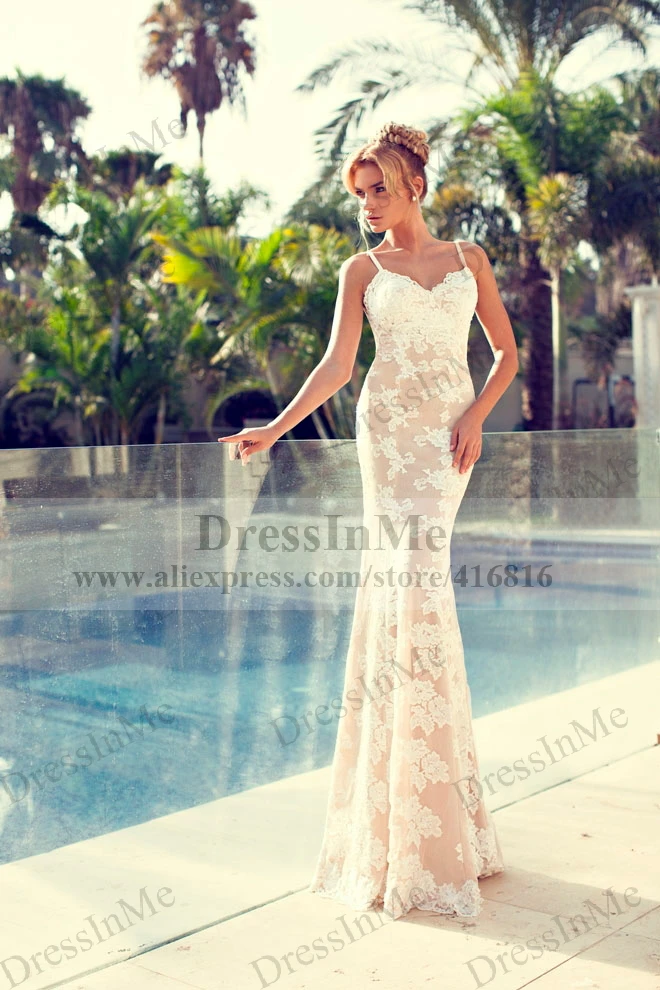 Spaghetti Straps Ivory Lace Over Nude Beach Wedding Dress Fit And