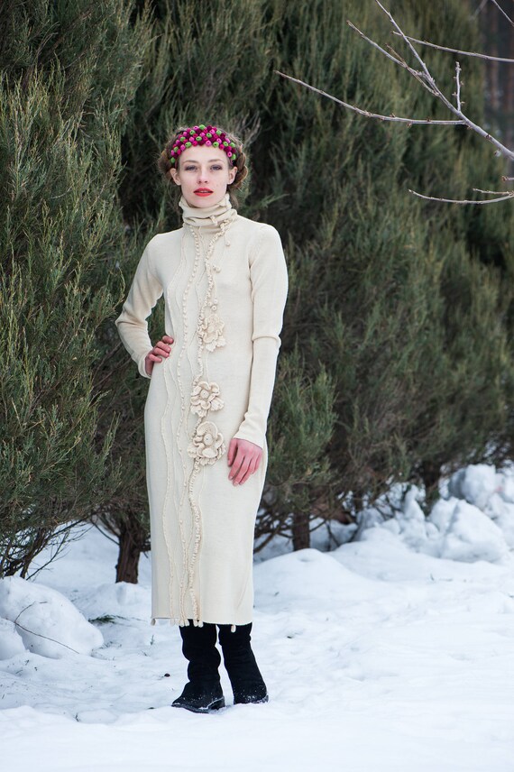 Exclusive Knit Wedding Dress Ecru Long Dress With Flowers Etsy