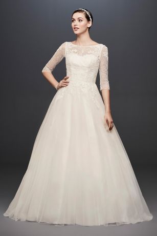Petite 3 4 Sleeve Wedding Dress With Lace Bodice David S Bridal