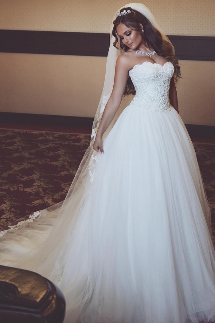 A Line Sweetheart Tulle Lace See Through Wedding Dress Chapel Train