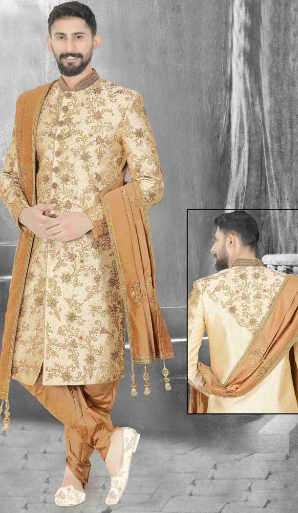 Cream Gold Readymade Wedding Wear Indo Western Men Sherwani