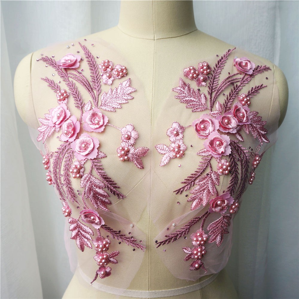 2pcs Pink Embroidery Pearl Lace Applique Flower Mesh Net Trim