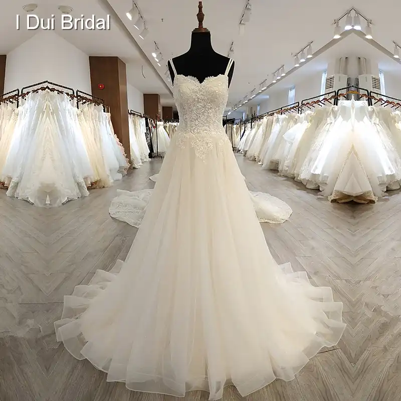 Unique Lace Tulle Wedding Dress A Line Spaghetti Double Strap