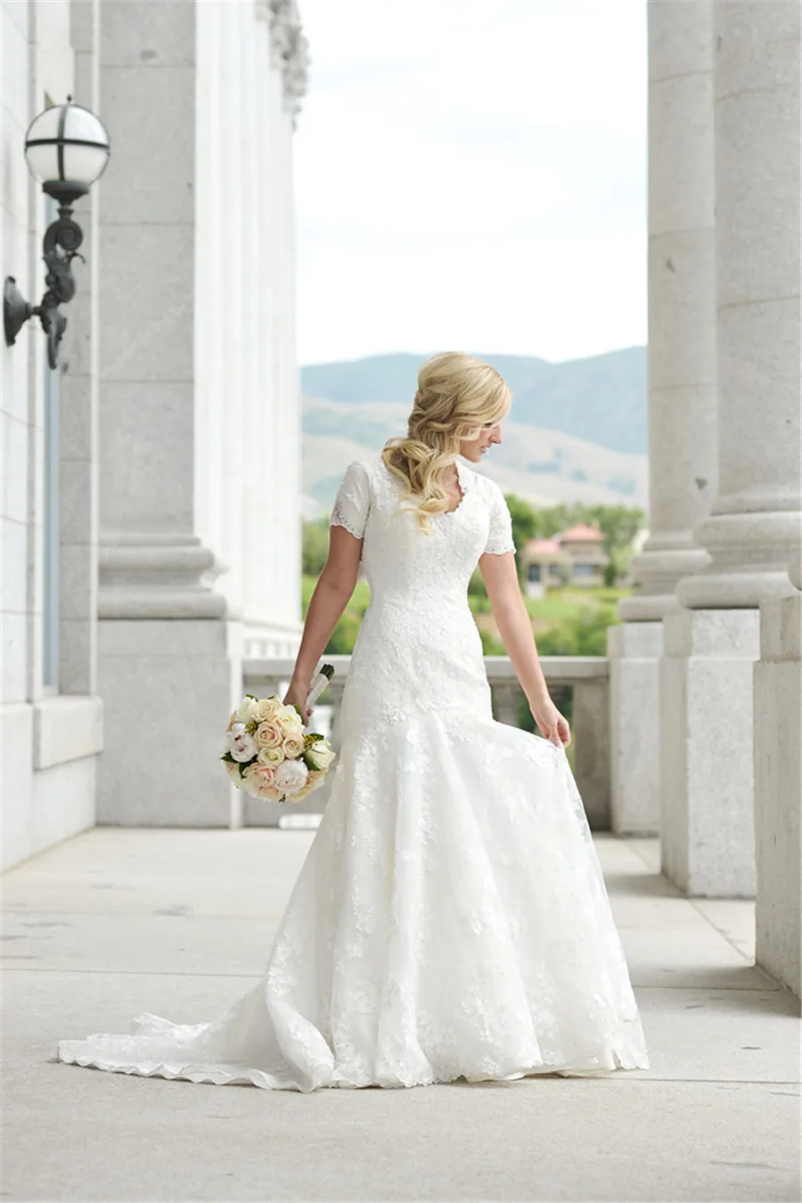 Ball Gown Modest Wedding Dresses With Short Sleeves Beaded Lace