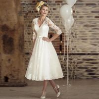 Vintage Tea Length Wedding Dresses With Three Quarter Sleeve Mid