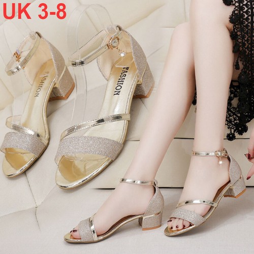 Womens Sparkle Diamante Low Mid Heel Sandals Wedding Bridal Prom