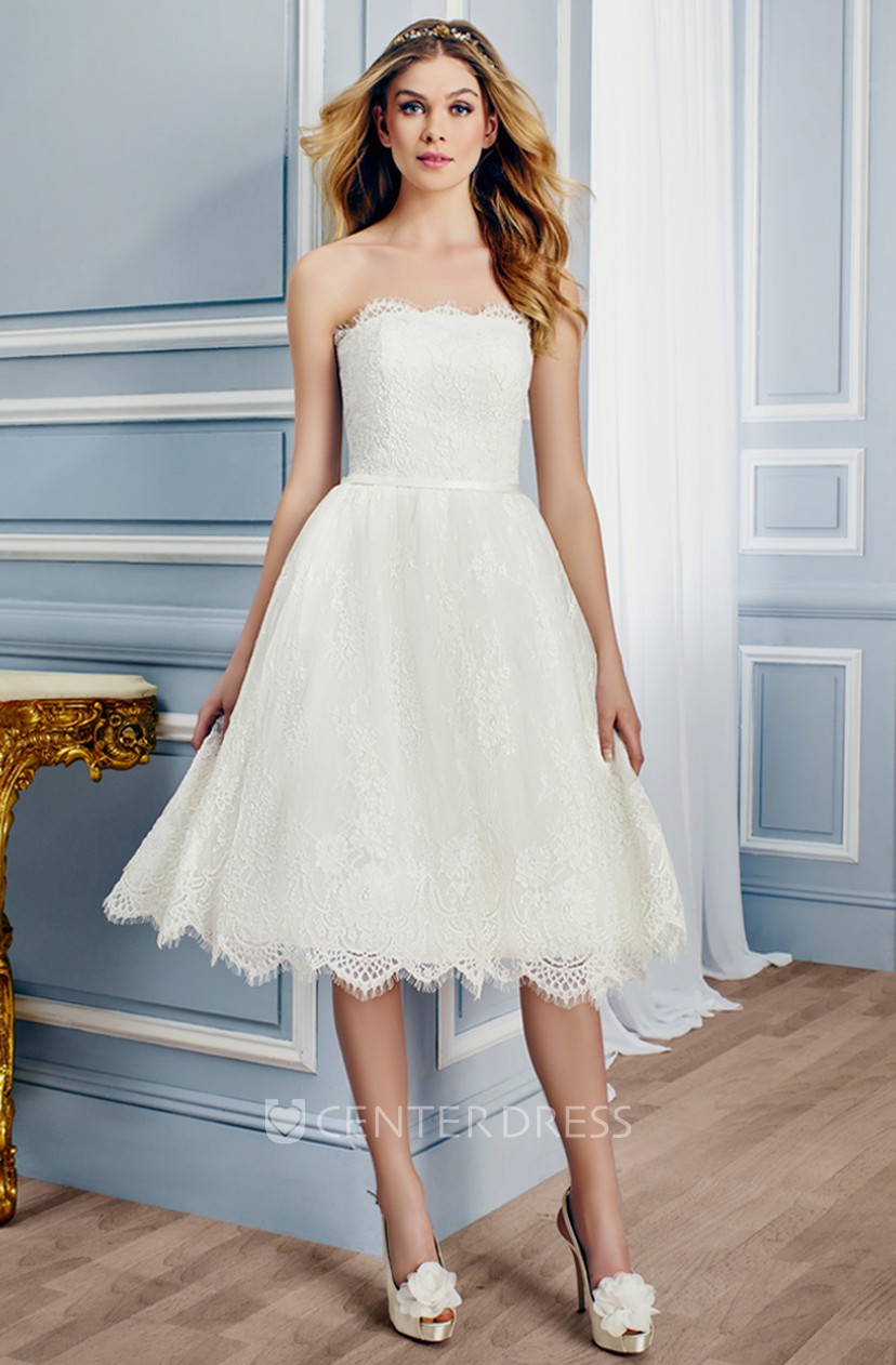 Strapless Tea Length Lace Wedding Dress With V Back Ucenter Dress