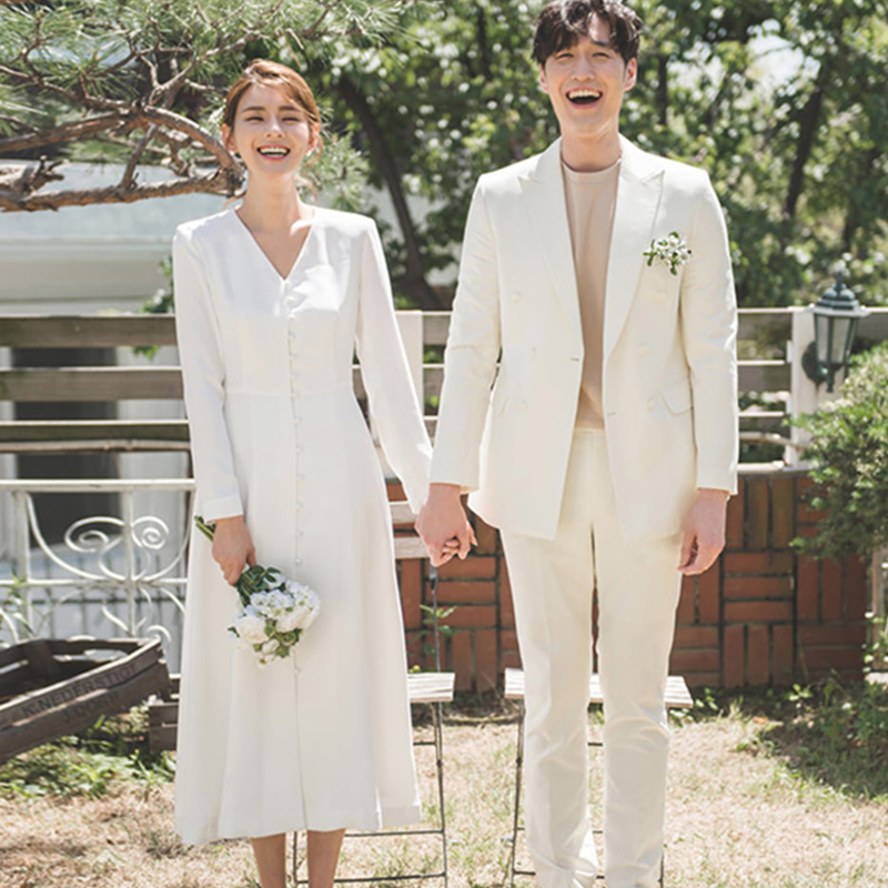 Buy White Deep V Long Sleeved Korean Satin Light Wedding Dress