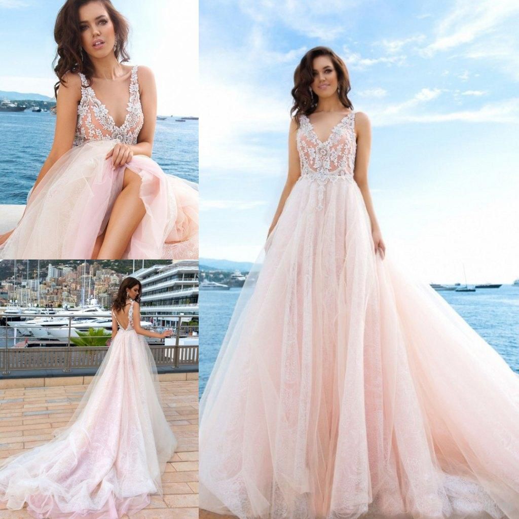 Discount Blush Pink Lace Wedding Dresses 2018 Beach Applique A