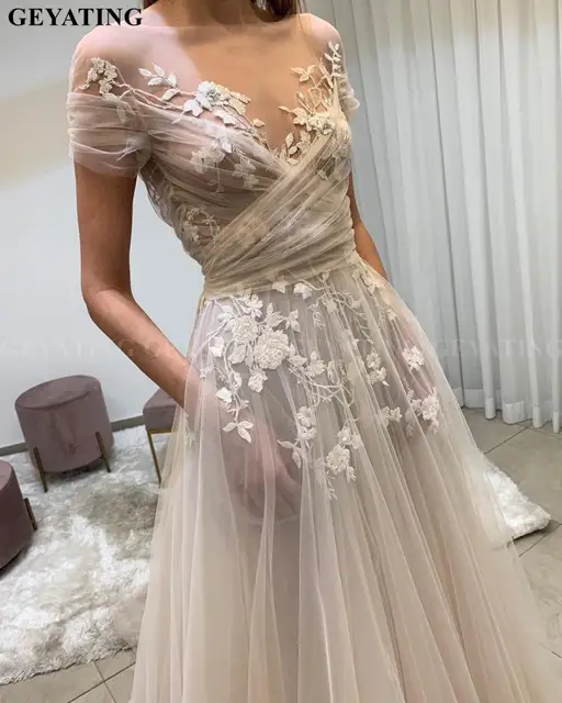 Vintage Sheer Lace Floral Boho Wedding Dress With Sleeve Pockets A