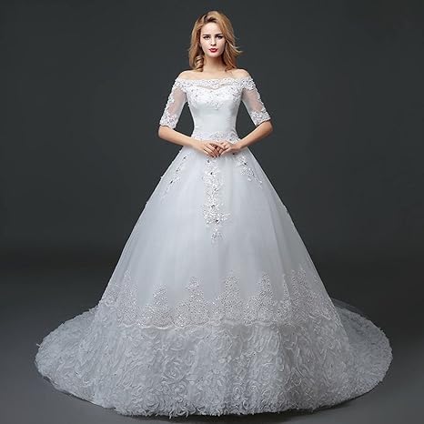 Korean Boat Neck Half Sleeves Wedding Dresses Ball Gown Lace