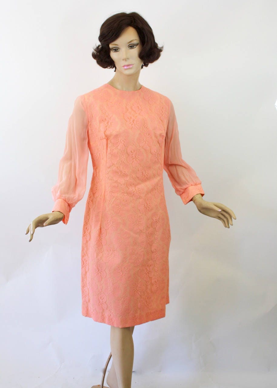 Vintage 60s Lace Party Dress Coral Lace Chiffon Long Sleeve Etsy