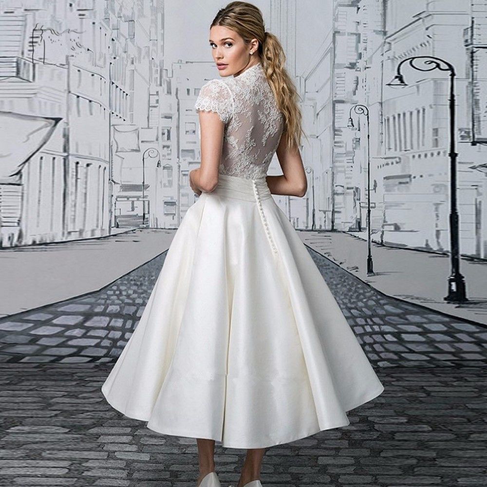Discount Vintage Lace Tea Length A Line Wedding Dresses 2020 V
