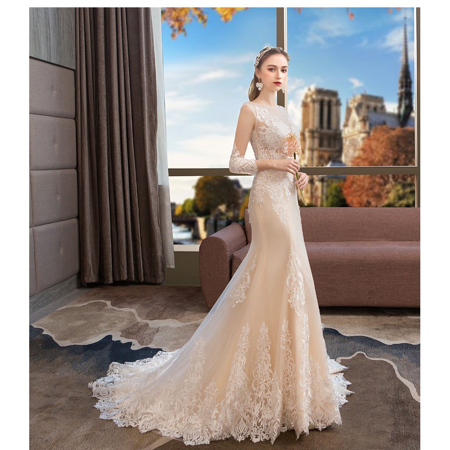 Po Cream Long Sleeve Mermaid Bodycon Fishtail Wedding Bridal Dress