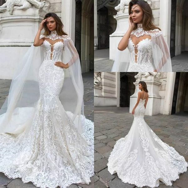 2019 Gorgeous Lace Mermaid Wedding Dresses With Cowl Back Caped