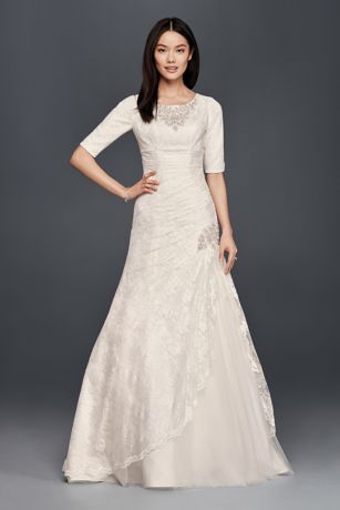 Scoop Neck Beaded Wedding Dress With 3 4 Sleeves David S Bridal