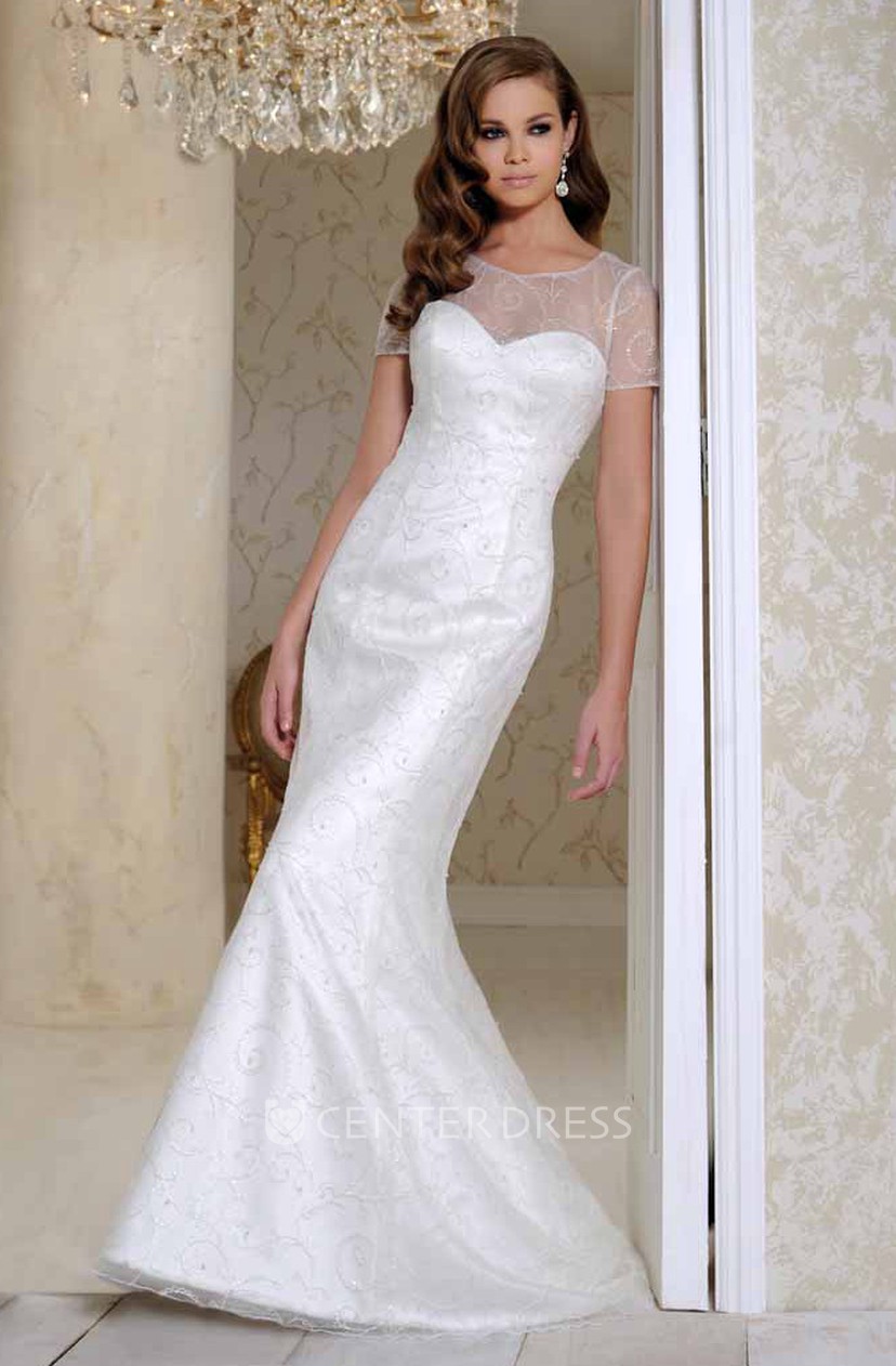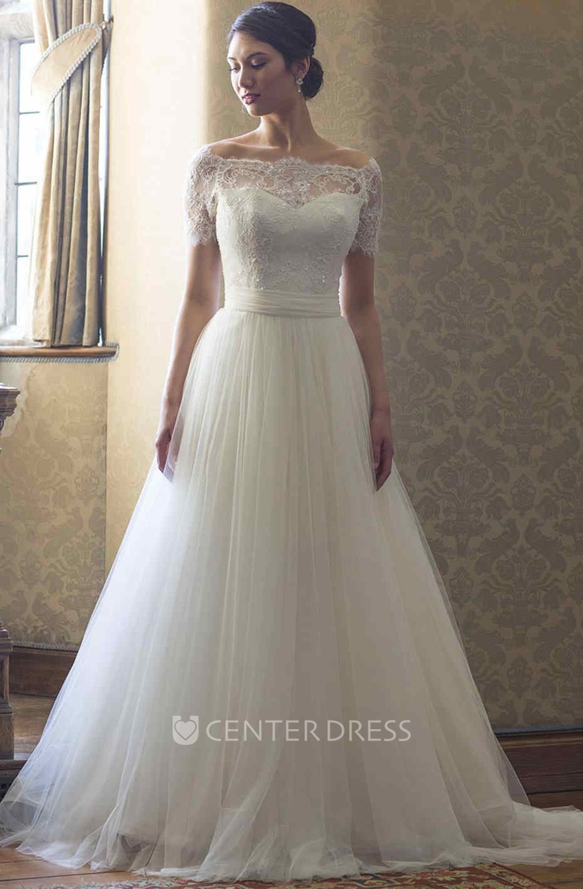 A Line Beaded Short Sleeve Bateau Neck Lace Tulle Wedding Dress