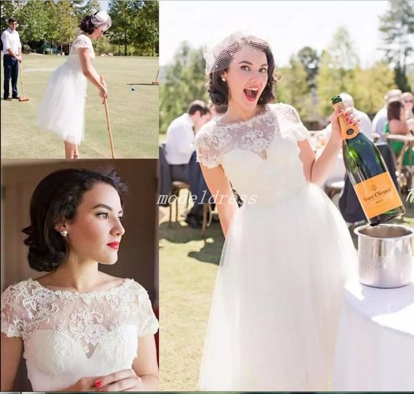 Discount Short White Wedding Dresses 2019 Bateau Short Sleeve Tea
