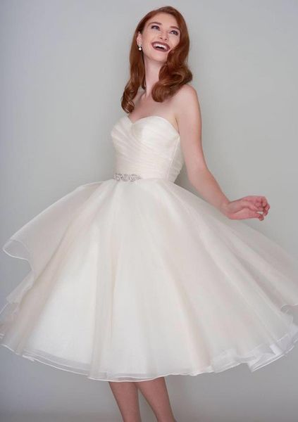 Simple Wedding Dresses Ivory Brocade Organza Strapless Tea Length