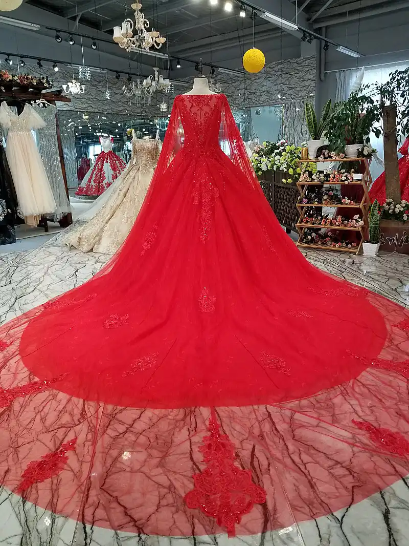 Ls01240 Red Wedding Dress Short Sleeve O Neck Ball Gown Elegant