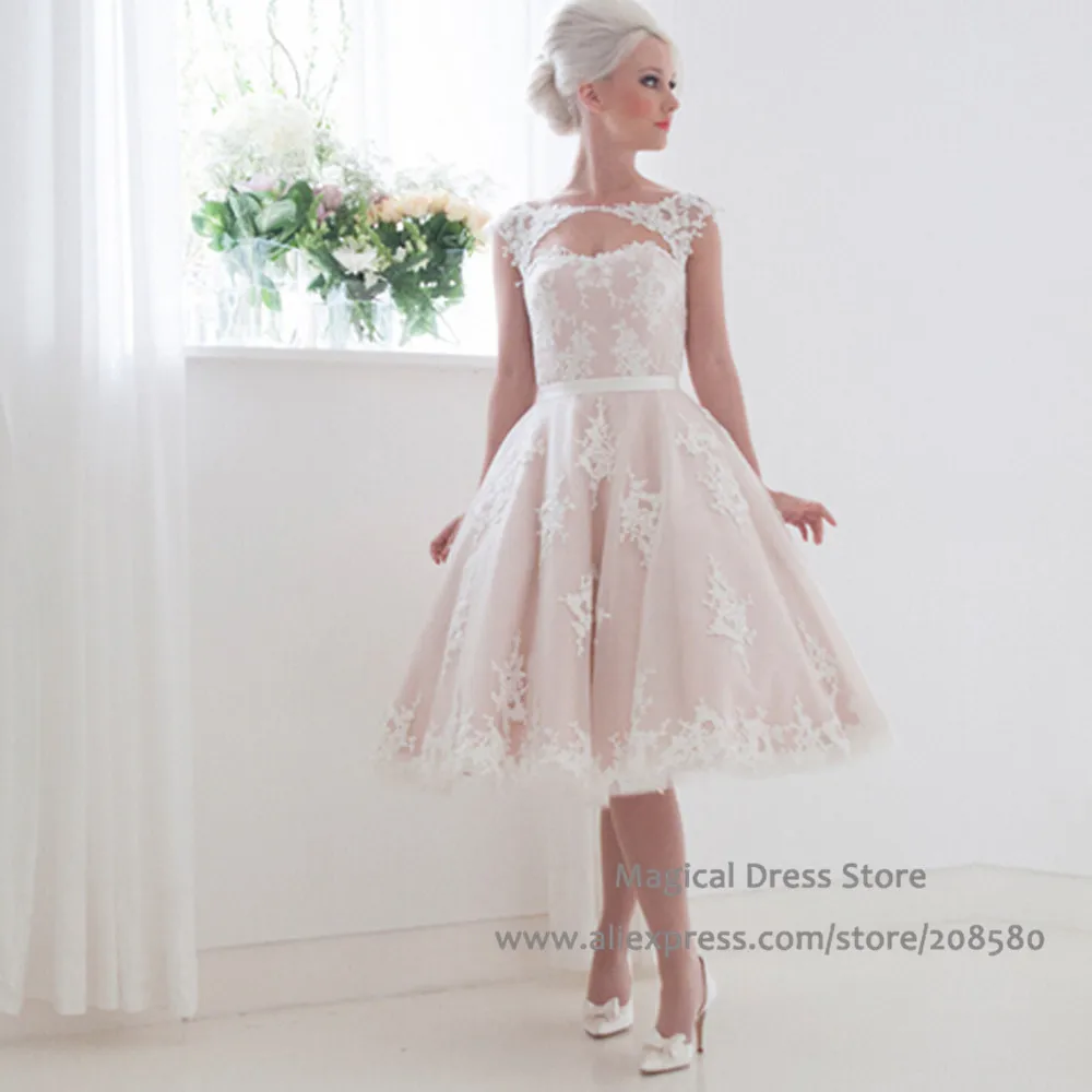 Fashion Blush Pink Short Wedding Dresses Tea Length Spaghetti