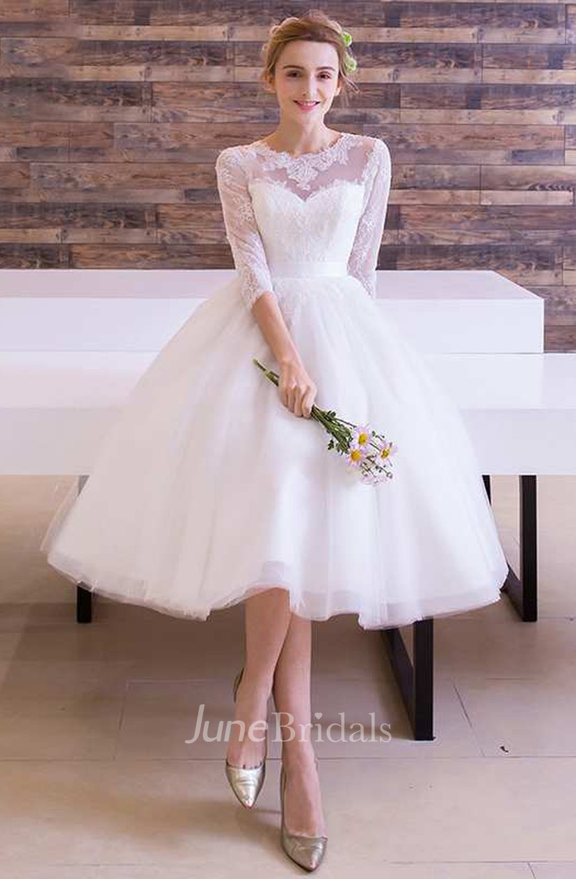Crew Neckline Lace Tea Length Wedding Dresses Long Sleeves