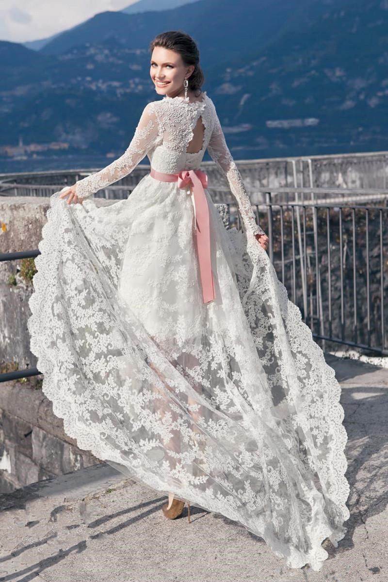 Discount Vintage White High Low Wedding Dress Long Sleeve Full