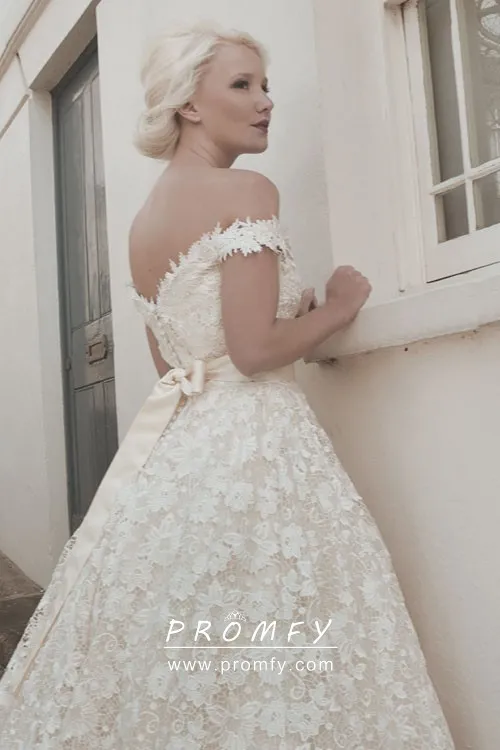 Off The Shoulder Tea Length Ivory Lace Wedding Gown Promfy