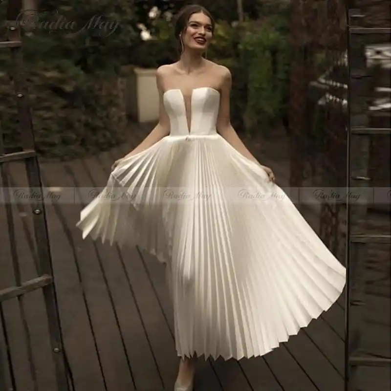 Retro Pleated Satin Ivory Wedding Dress A Line Tea Length Casual