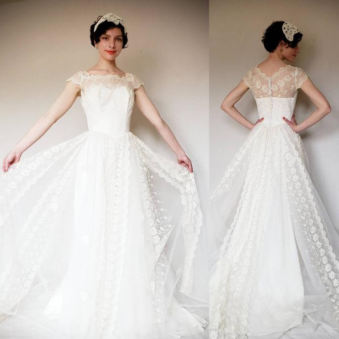 1950s Wedding Dress White Floral Embroidery Lace 50s Capped