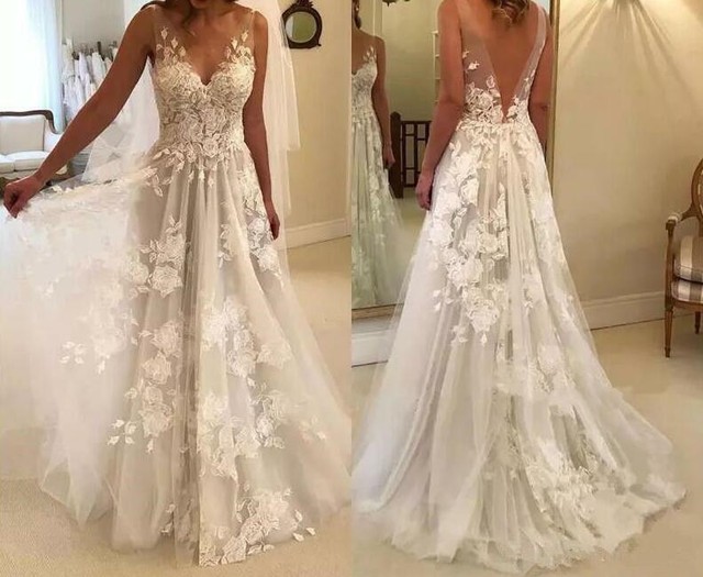 Sexy Spaghetti Straps Backless Lace Wedding Dresses Bridal