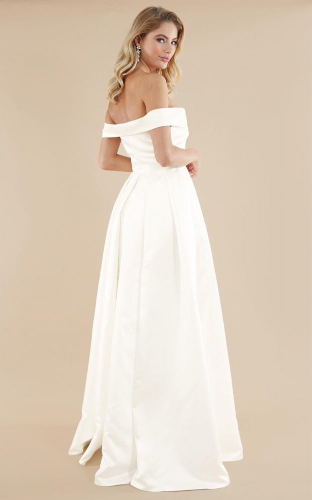A Line Off The Shoulder Ivory Satin Wedding Dress With Lace